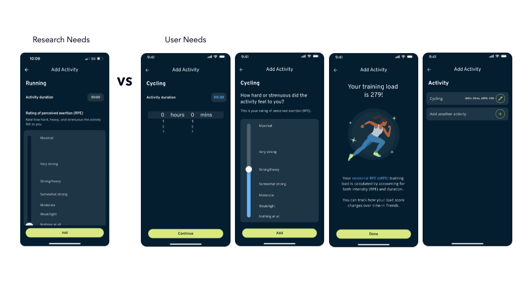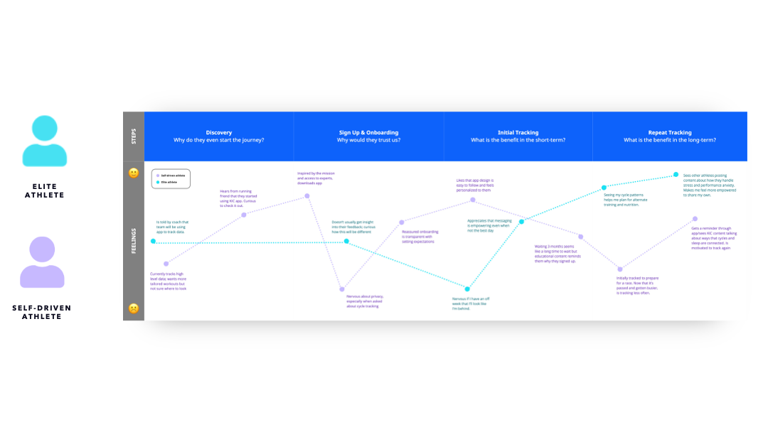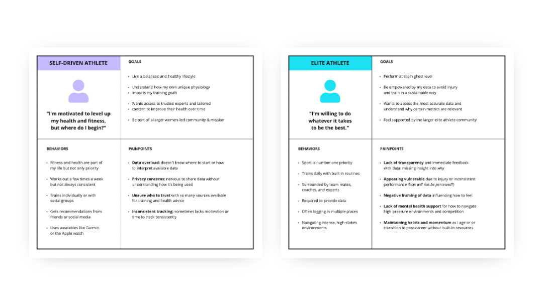 While the app’s core target audience was professional female atheletes, this is a small group of users and would limit data ranges and quantities for research. We wanted to design it in such a way that any menstruating individual could leverage it to track and learn about their cycles and how they impact other aspects of their health and wellness. We determined two main personas, the Self-Driven Athlete and the Elite Athelete and gathered information of their needs and pain points.