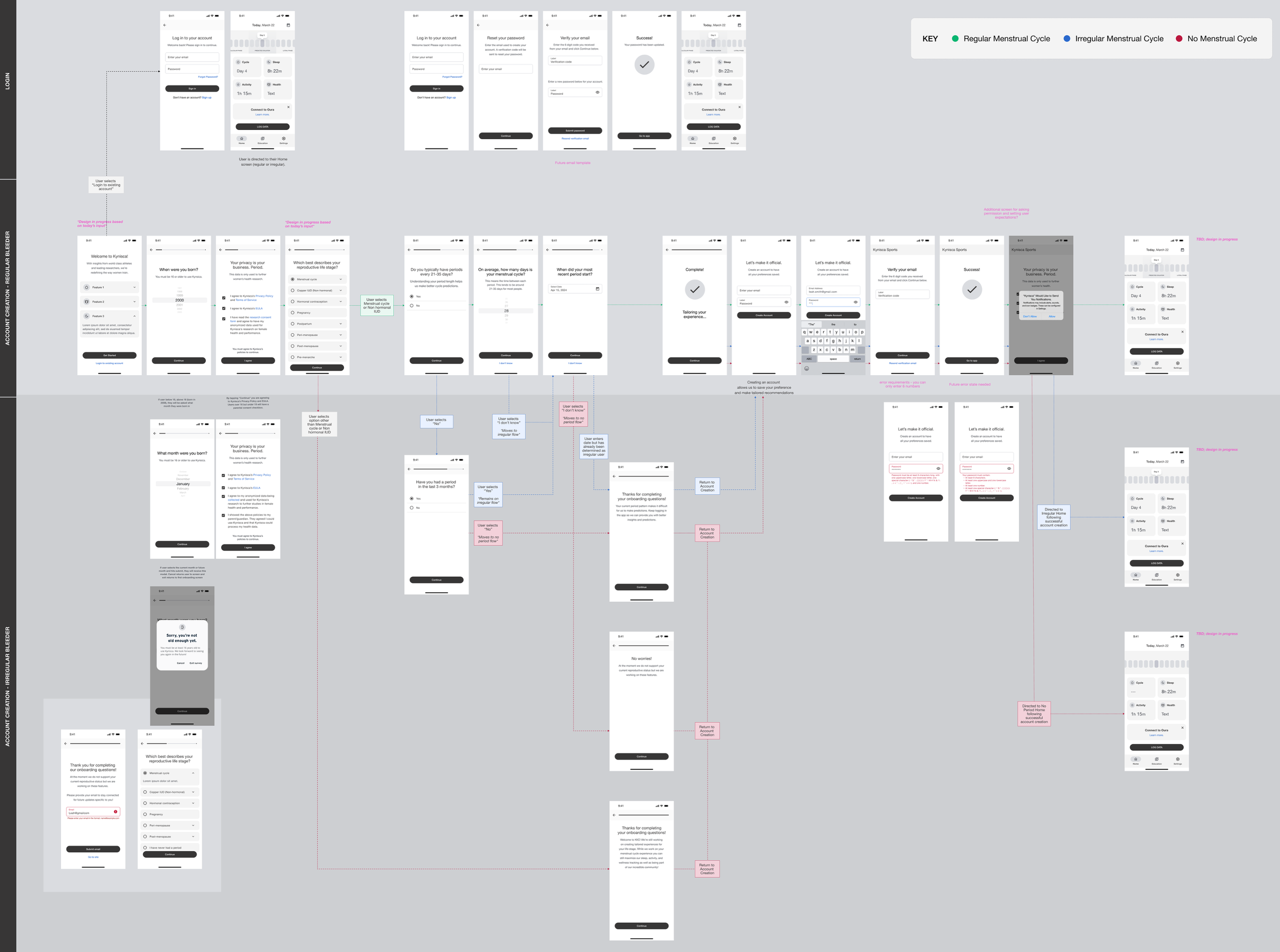 Every menstrual cycle is different and so determining cycle and phase predictions requires a certain amount and type of data that are dependent on the user type or profile. We mapped out different user flows and potential questions and interactions throughout onboarding to determine these dependencies.